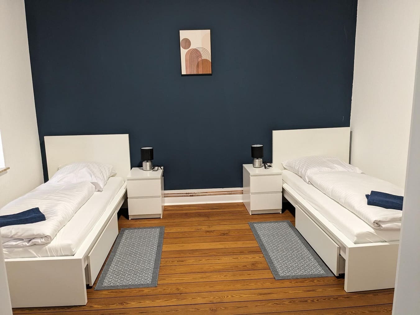 Die Wohnung im 1. OG verfügt über 3 Doppelzimmer und 1 Einzelzimmer. Insgesamt können 7 Personen hier wohnen. Den Gästen steht eine Küche, ein gemeinsames Esszimmer, sowie 2 Badezimmer zur Verfügung.